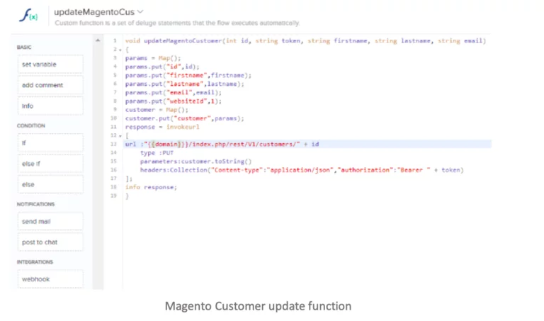 Zoho Flow has a ready-to-use integration app, which requires simple manipulations like drag-and-drop bricks or data field mapping. You can also write custom functions on Zoho Flow using Zoho Deluge Script.